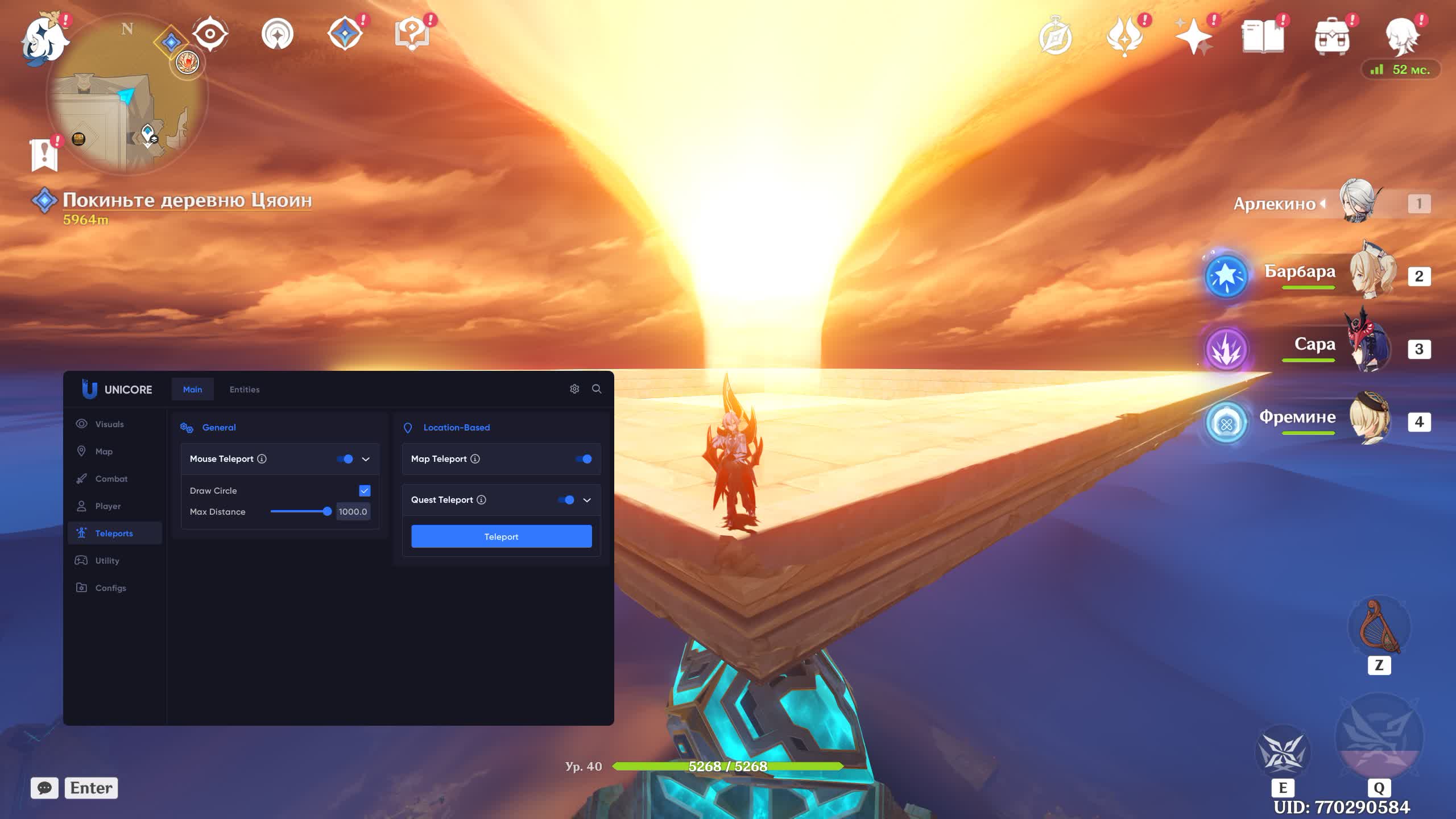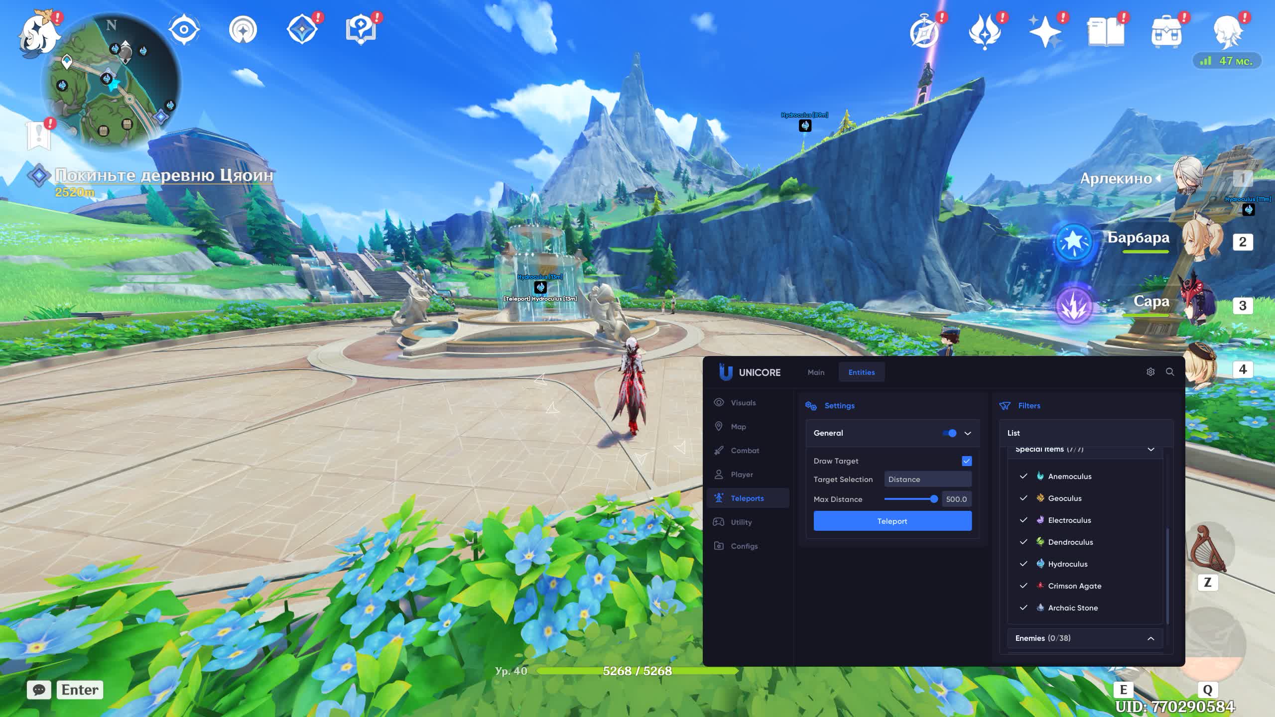 Чит геншин с функцией телепорта — это лучший способ сэкономить время. Unicore активно развивает эту возможность, позволяя игрокам мгновенно перемещаться к сундукам, руде или квестовым целям, полностью избавляя от необходимости бегать по карте.