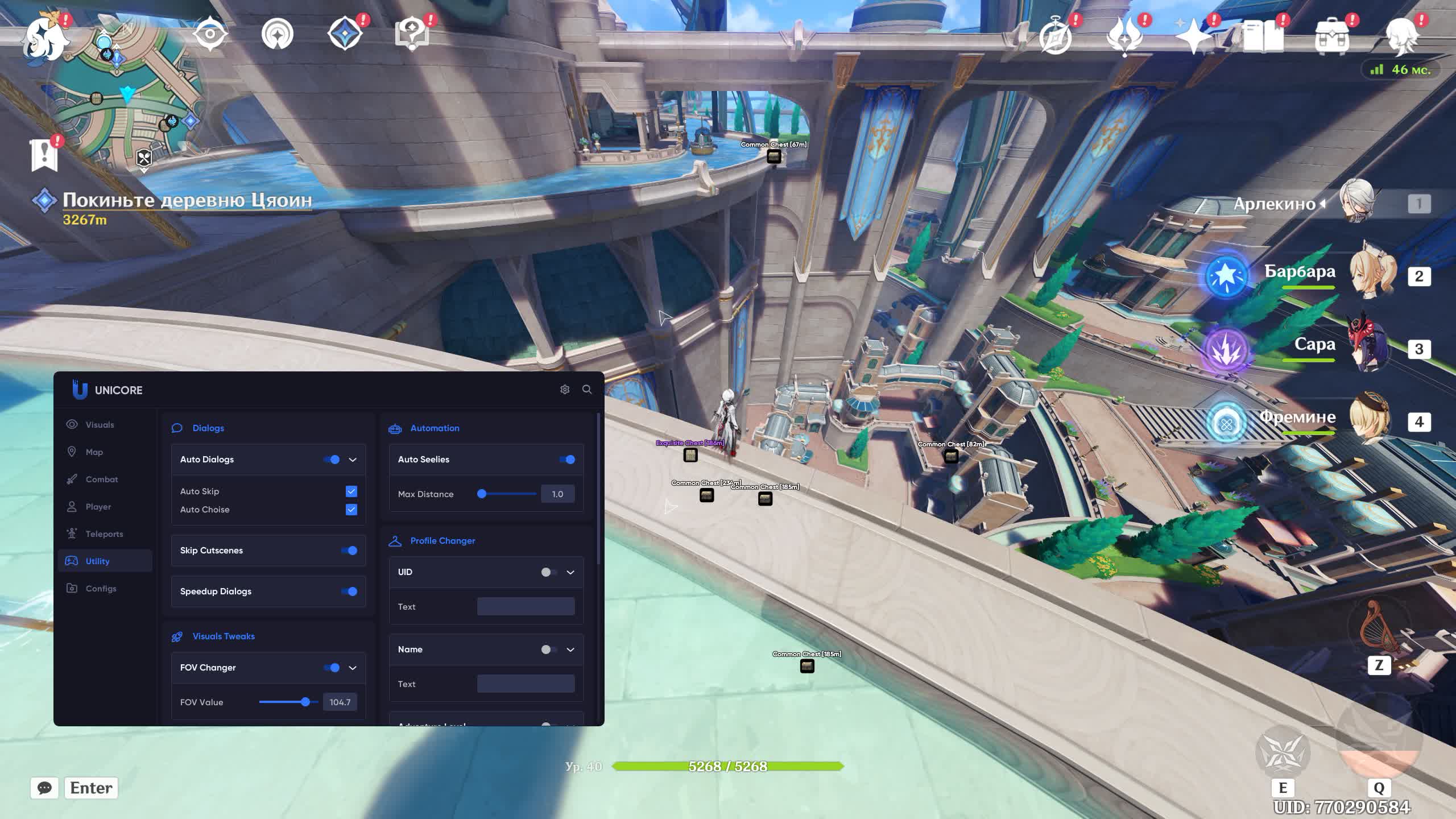 Надоели длинные диалоги? Чит для геншина Unicore включает функции для их пропуска. В сочетании с телепортацией к квестовым точкам это позволяет проходить сюжетные задания в несколько раз быстрее.