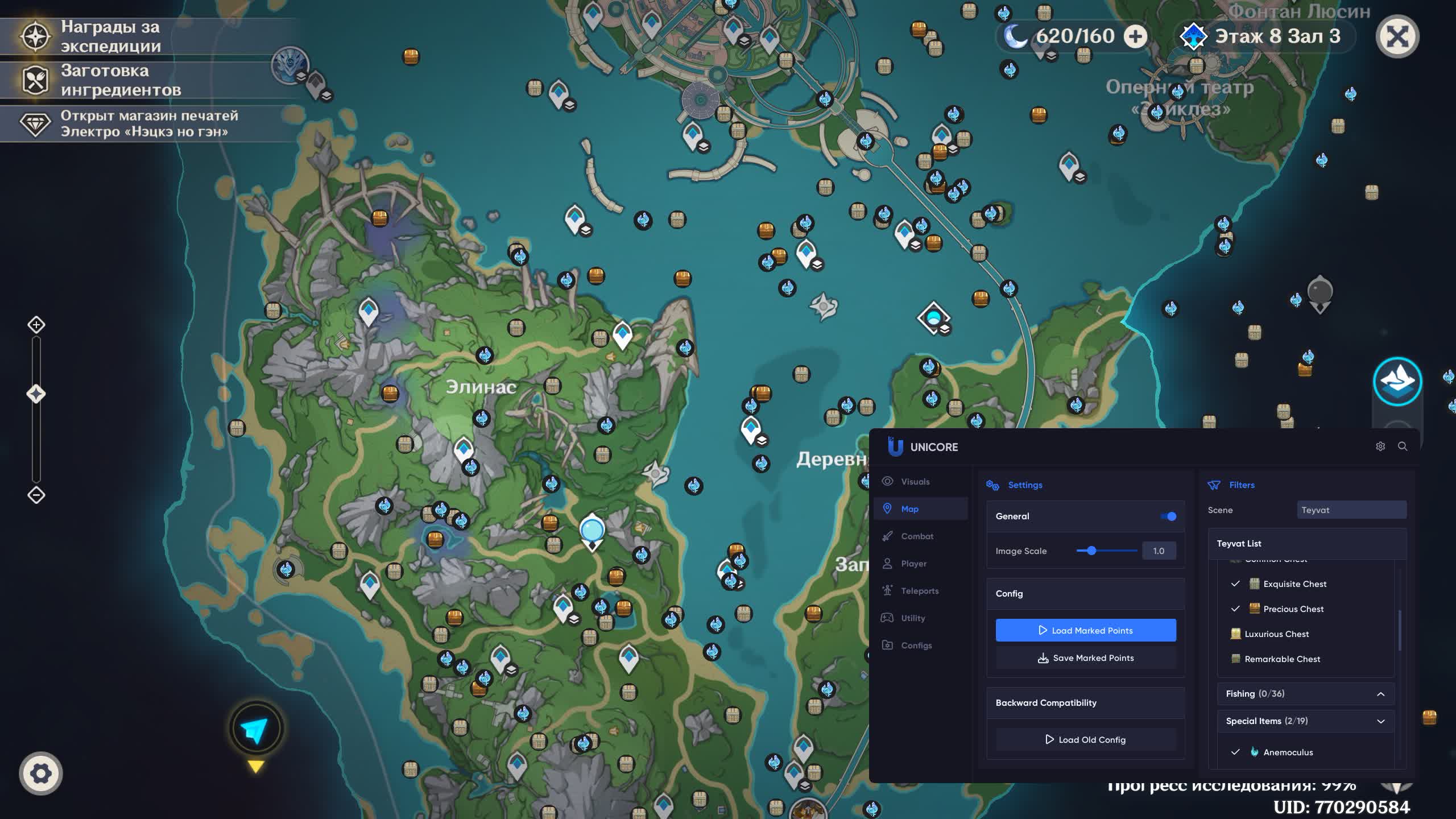 Чит геншин импакт от Unicore выводит использование карты на новый уровень. В отличие от браузерных карт, здесь все отображается в реальном времени прямо в игре, и ваш прогресс сохраняется. Это делает исследование мира гораздо удобнее.
