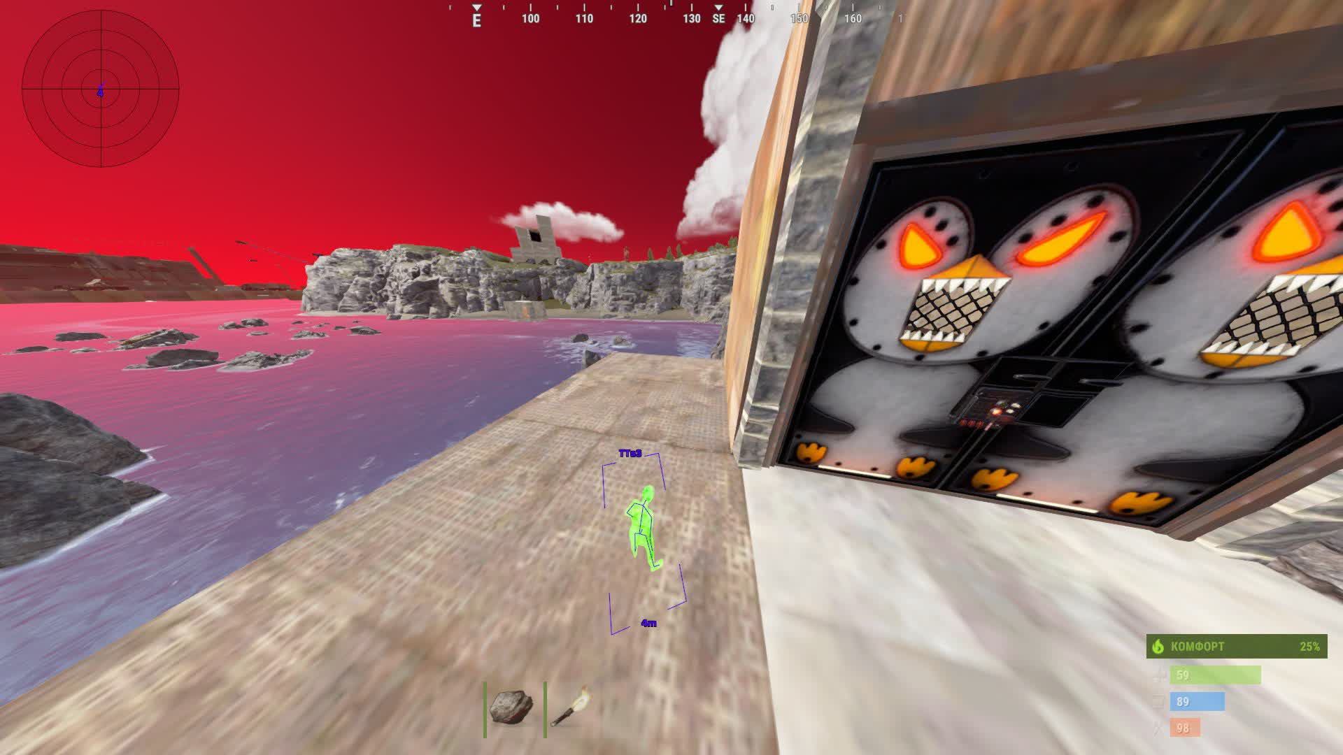 ESP на размещаемые объекты: Показывает шкафы (с информацией о здоровье и содержании), верстаки, переработчики, тайники, спальные мешки, батареи и всю RF/электро-систему.